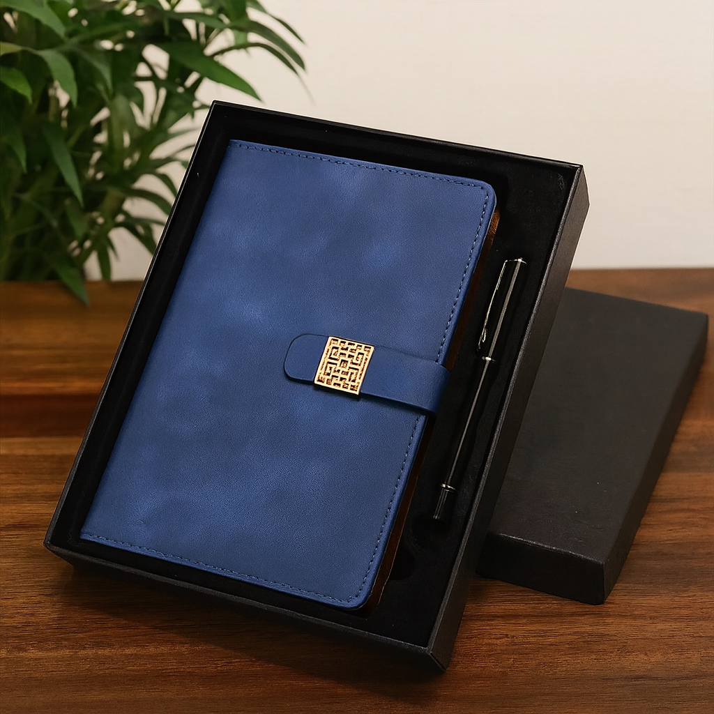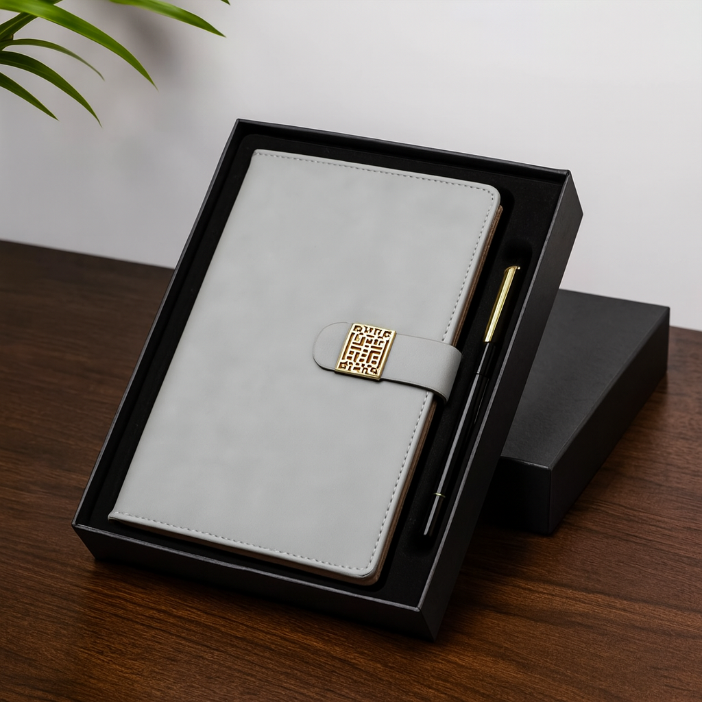 Elegant PU leather notebook and pen gift set featuring lined pages, a geometric strap with metallic detail, and a sleek ballpoint pen. Perfect for professionals, students, or gifting.