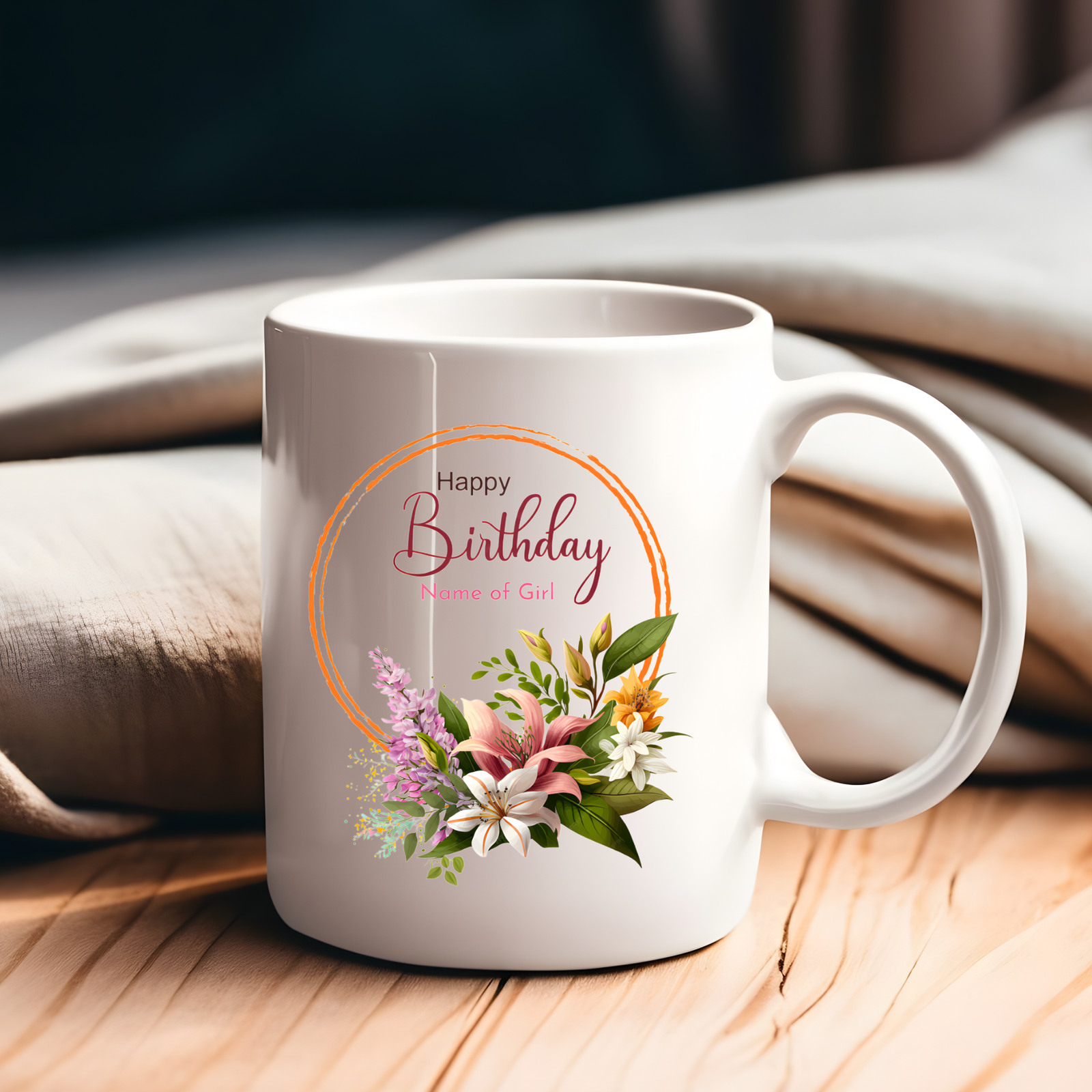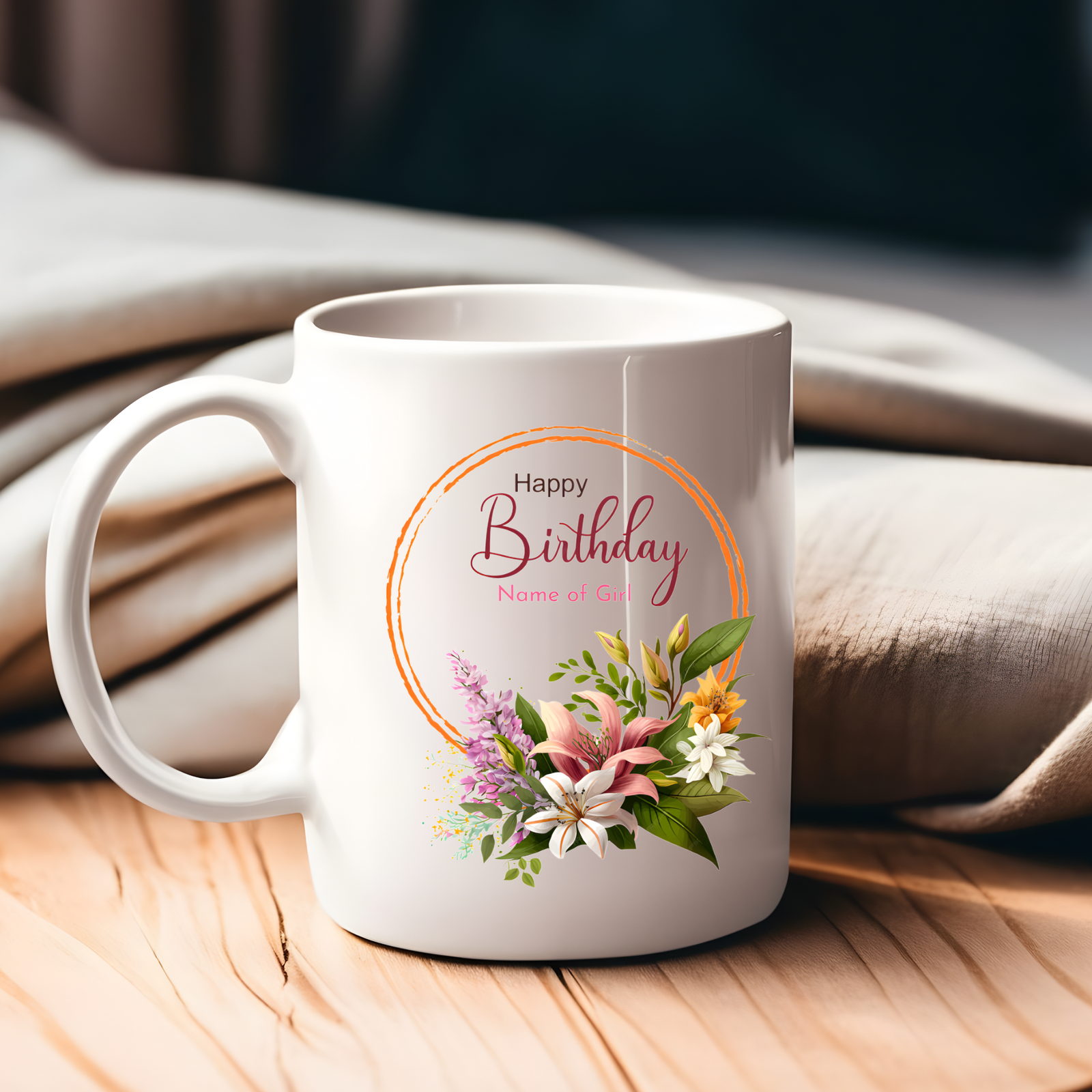 This Flower Wreath Birthday Mug showcases a stunning floral wreath design encircling a cheerful birthday message — ideal for enhancing someone’s special day.